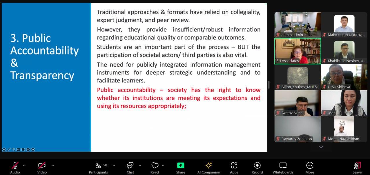 The keynote speaker of the seminar was the internationally recognized expert, Professor Ellen Hazelkorn, who shared best practices in quality assurance, institutional development, and strategic management within the European Higher Education Area. The seminar became one of the important initiatives under the Erasmus+ Programme aimed at strengthening quality, transparency, and international alignment in Uzbekistan’s higher education system.