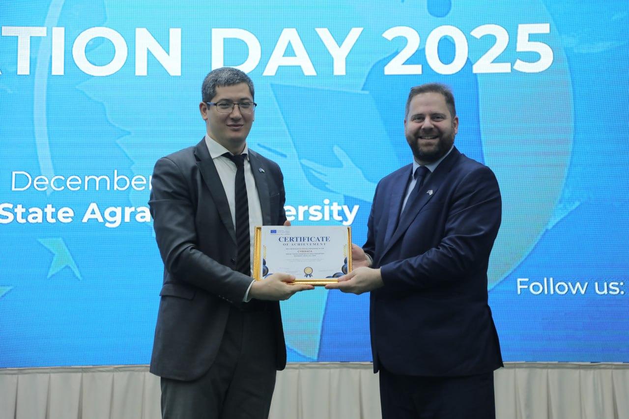 Tadbir davomida Yevropa Ittifoqi delegatsiyasi O‘zbekistondagi hamkorlik bo‘limi rahbari janob Christos Marazopoulos Erasmus+ 2025-yil tanlovi g‘olibi bo‘lgan oliy ta’lim muassasalariga sertifikat va esdalik sovg'alarni taqdimot qildi.